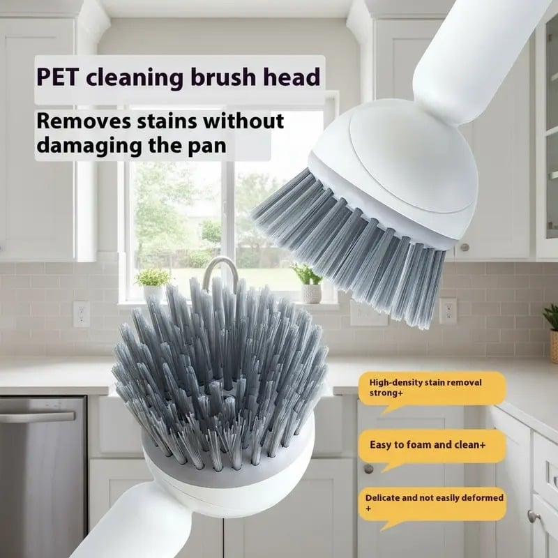 Revolutionize your kitchen cleaning with this 6-in-1 rotatable brush, featuring 360° scrubbing, an adjustable handle, a built-in detergent dispenser, and durable bristles to tackle everything from tough oil stains to delicate cookware with ease.