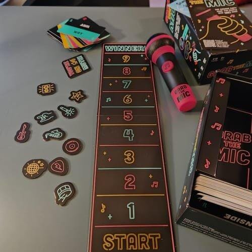 INSIDE - With 125 word cards, a foam microphone, game board, player tokens, and easy-to-follow instructions, everything you need for a memorable game night is included. Get your friends and family together for hours of musical entertainment with Grab The Mic!