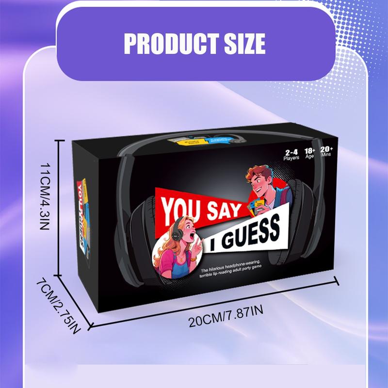 X-Rated Lip Reading Game for Adults: Get ready for the ultimate adult party game! YOU SAY I Speculation is the funniest game for adults, packed with risqué and ridiculous phrases that will have your group in stitches. Whether it’s game night or bachelorette party, this adult card game delivers nonstop laughs.·Speculation the Phrase Through 116db of Music: Slip on our custom-made YOU SAY I Speculation headphones turn lip-reading into a hilarious challenge—perfect for player games for adults! With a built-in timer, the fast-paced action keeps the energy high, making it one of the best party games for adults. Can your team Speculation right under pressure?·Hilarious & Unpredictable Speculation: With 100 word cards and 40,000+ outrageous combos, this adult board game guarantees fresh, laugh-out-loud moments every round. Will your friends Speculation "hot date" or something way dirtier? It’s the perfect icebreaker for game night with groups of adults!·Instant Fun – No Learning Curve: The easiest fun game for adults, just grab friends, put on the headphones, and let the madness begin! This is a must-have for any adult game collection.·What’S Included: 100 hilarious word cards (endless adult card game fun)—Custom wireless headphones (charging cable included)—Quick-start rules, play in seconds!